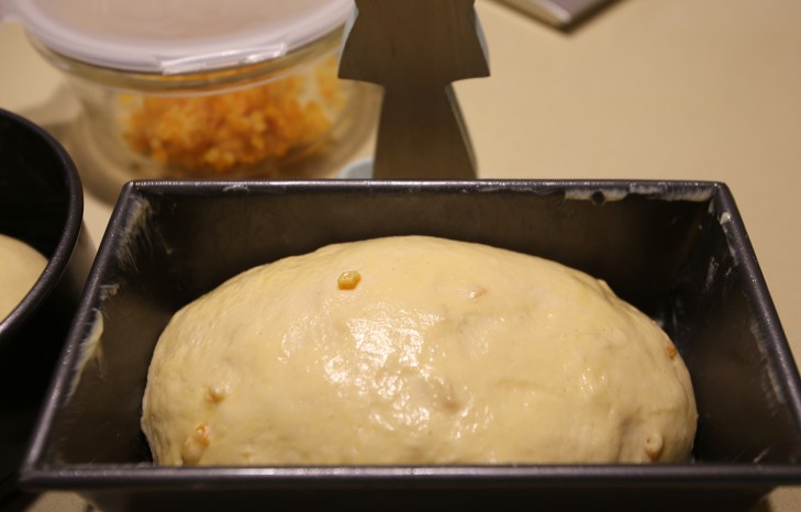 Fermented dough has been prepared a day before and I keep in the fridge. I got the experience that looking at the fermented dough, I can guess how my brioche will be. A good fermented dough will create a good bread. Back to kneading, please do add the mixture of orange confit soaked in Cointreau and vanilla liquid at the end, just before the egg that we reserved for “bassinage”. The kneading time is about 15-20′, the first 5′ at the first speed then the rest at the second speed. The dough is sticky but easy to handle after a night in the fridge. I leave the dough at the room temperature for 1 hour, after kneading, then right to the fridge until next day.