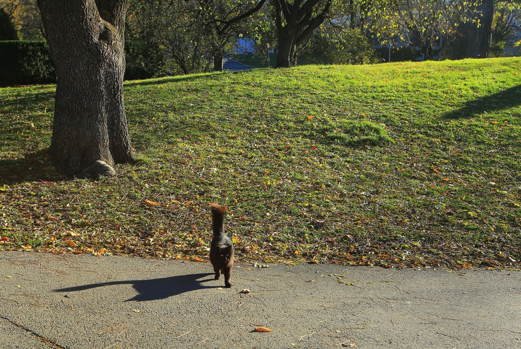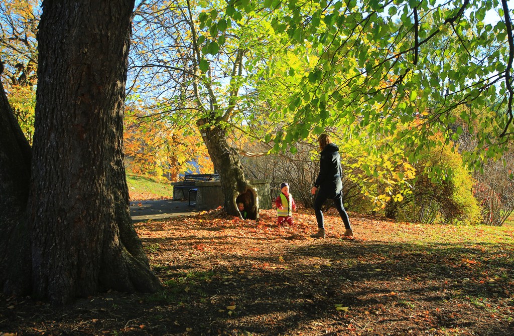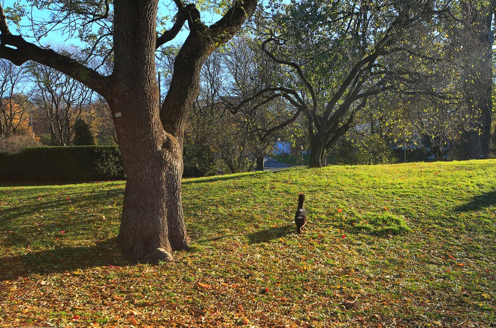 Quay lại sáng hôm đó ở Oslo. Đã cuối Thu chiếc áo vàng rực rỡ trên cây đã đan thành tấm thảm vàng khô, héo giòn dưới đất. Đi lòng vòng trong vườn, lúc thấy bà mẹ chơi với hai con gần gốc cây, một đứa chun vào bọng cây ngồi…ai lúc bé cũng thích núp mình trong hang trong xó! Chủ nhật nên mấy nhà kính đóng cửa, nhìn qua mái kính mờ tôi không thấy gì nhiều, chắc vườn đang chuẩn bị ươm hoa trồng Xuân. Đi loanh quanh một hồi, làm bạn với tôi có chú mèo đen lửng thững đi quanh, được một hồi là lạc nhau. Các nhà kính ươm cây cũng đóng cửa, rồi viện bảo tàng thực vật gần đó cũng vậy…tiệm cà phê sát bên chỉ có vài khách…tôi đứng nhìn quanh, tận hưởng cái nắng ban mai se lạnh trong một không gian thoáng đản!