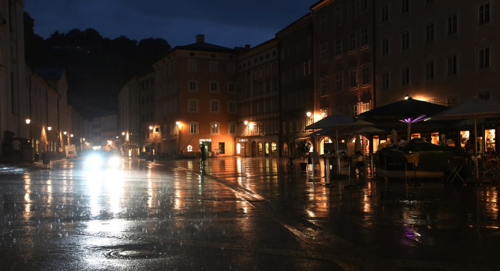 Vì ở quanh khu phố cổ nên tôi không có dịp khám phá phần mới của Salzburg, quanh quẩn trong khu có di tích và viện bảo tàng Mozart, có khu mua sắm và khá nhiều nhà hàng, tôi chờ đến tối khuya, trời dịu mát mới thong dong đi đây đó…thì lại trời mưa, mọi người đứng trú khá lâu dưới một vòm cổng, mưa khá lớn, kéo dài gần cả tiếng!