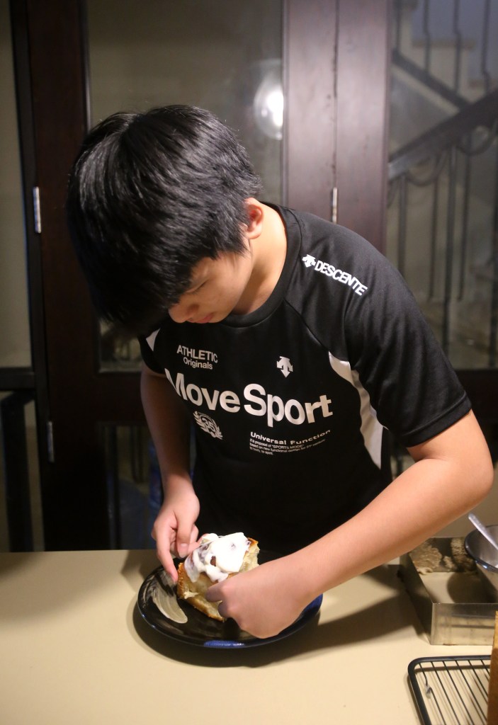 Baking for the first time is very interesting experience for the young boy as he witnessed and learnt many new things – kneading, rolling, cutting and especially proofing but surely to enjoy the freshly-baked bread, right from the oven, is heavenly good! So let’s hope the young man will fall in love with baking, pastry so he will be able to create something fabulous in the future! Good start!