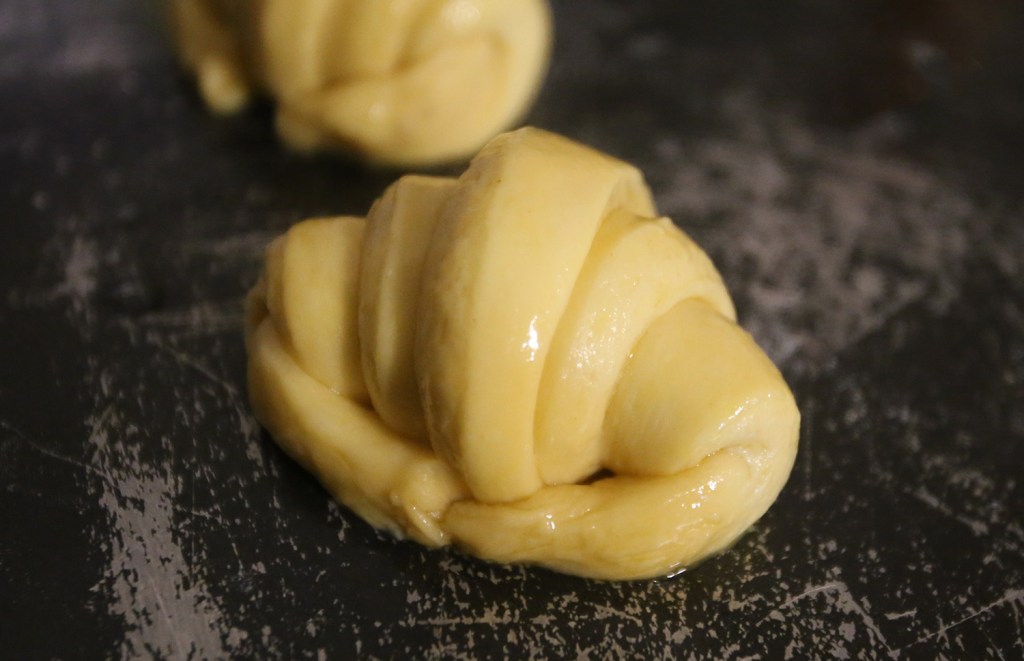 How to create the horn, it’s exactly the same procedure as we do the croissant, except these two tails – make them bit longer and fold towards the main body. To be honest I prefer this “horn” shape than the ones we did in Paris – with a little head on the top of the brioche!