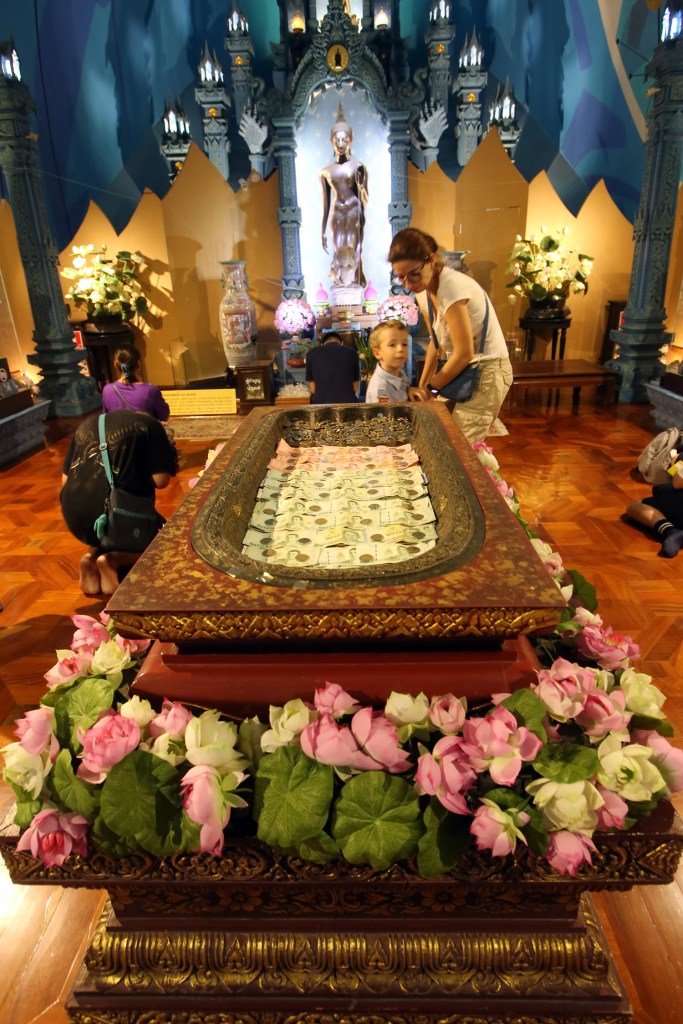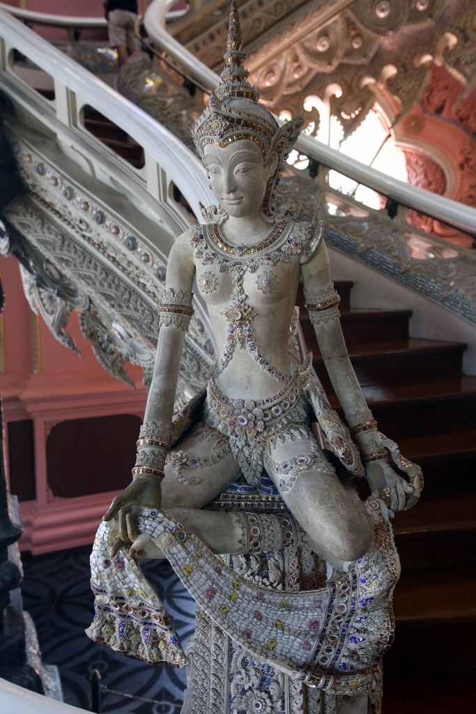 Lúc tôi đến không đông khách viếng, đến trưa lượng khách cũng không hơn bao nhiêu! Loay hoay một hồi phía bên ngoài, nhìn cách người Thái cúng dường, xin quẻ, xong tôi mới bước vào trong đền! Ấn tượng đầu tiên của tôi là …choáng ngợp, cầu thang chính toạ ngay giữa đền, uốn lượn như rồng bay lên đáp xuống, rồi cách trang trí bên trong, những bức tượng dọc theo cầu thang như đưa ta vào một thế giới thần tiên!