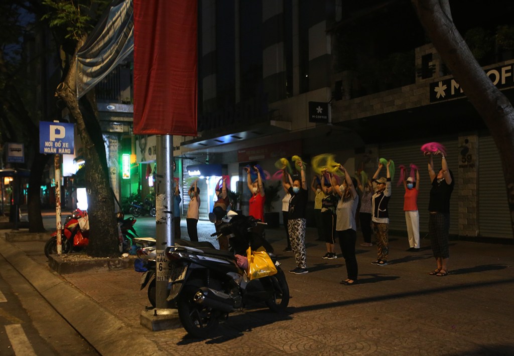 5:15 sáng – mấy lần đạp ngang qua, thấy mọi người tập thể dục lúc với nón lá, lúc với quạt và hôm nay là vãi lụa.