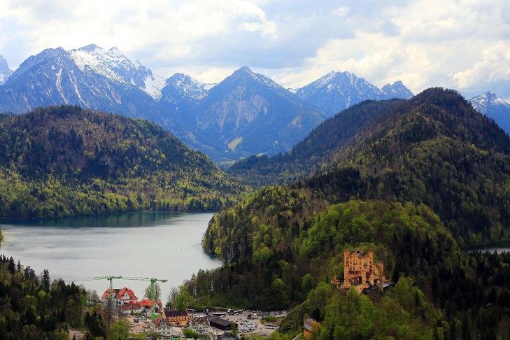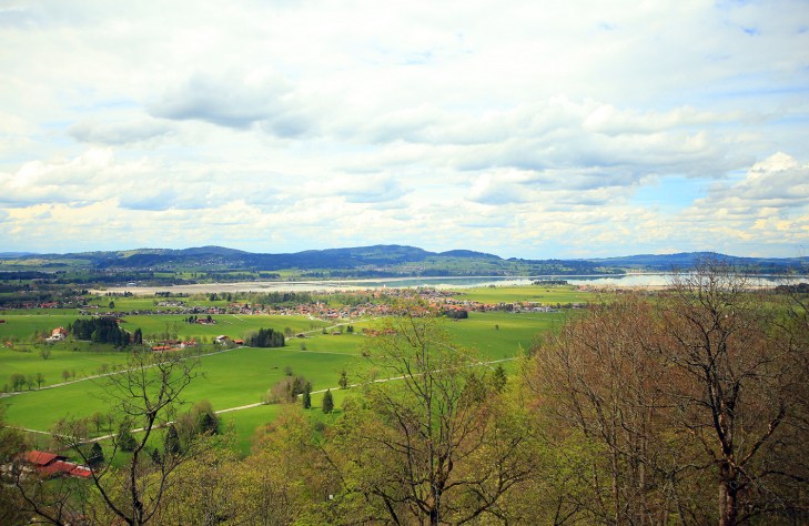 Chúng tôi thích thú đứng ngắm cảnh chung quanh từ ban công lâu đài, thả mắt xuống vùng đất xanh mướt Bavaria, nhìn về dãy Alpes hùng vĩ, càng về sau, khách càng đông, tiếc là cây cầu để chụp toàn cảnh lâu đài đang trùng tu, chúng tôi đành chia tay lâu đài, chia tay vị Vua đầy ảo mộng, từ giã ngôi làng với những cỗ xe ngựa lúc nào cũng vang lên tiếng nhạc chuông vui tai.