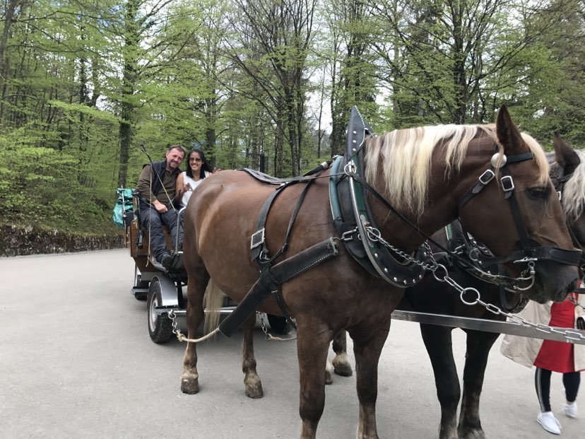 Chuyện đi đến toà Lâu đài Neuschwanstein không khó nhưng không hề đơn giãn, từ việc mua vé online trước mấy ngày cho khung giờ tham quan trong vòng 35 phút, chúng tôi phải tính toán sao đến đúng giờ, vì đi tàu từ Munich đến Füssen gần 2 tiếng rưỡi, sau đó lại đón xe buýt từ Füssen đến ngôi làng Hohenschwangau, rồi từ làng, hoặc đi xe ngựa hoặc leo dốc khoảng chừng 30-40 phút mới lên tới lâu đài! Lên trễ quá khung giờ đã chọn, khách hình như phải mua vé lại ở quầy bán vé dưới làng, và thường phải xếp hàng cả tiếng! Chắc sợ trễ, cả ba đến quá sớm nên có cả tiếng đi quanh quẫn trong làng, ngắm cảnh và cả bầy thiên nga bên hồ.