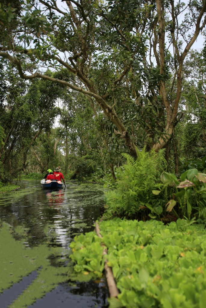 Nhờ cậu hướng dẫn chúng tôi nghe nhiều câu chuyện thú vị, nhiều cụm từ như một bản đồng dao quay quanh 7 loại trái cây đặc sản ở Tiền Giang bắt đầu bằng sơ ri Hiệp Phát, hay các loại cây trong rừng ngập mặn – nhất đước, nhì…gì chắc không ai trong chúng tôi còn nhớ! Cả chi tiết bà Chúa Xứ không phải Bà mà là Ông, là thần Shiva, rồi cả chuyện đắp đê chống lũ theo cách miền Bắc đem vào miền Tây hoàn toàn không phù hợp với vùng sông nước màu mỡ phù sa!
