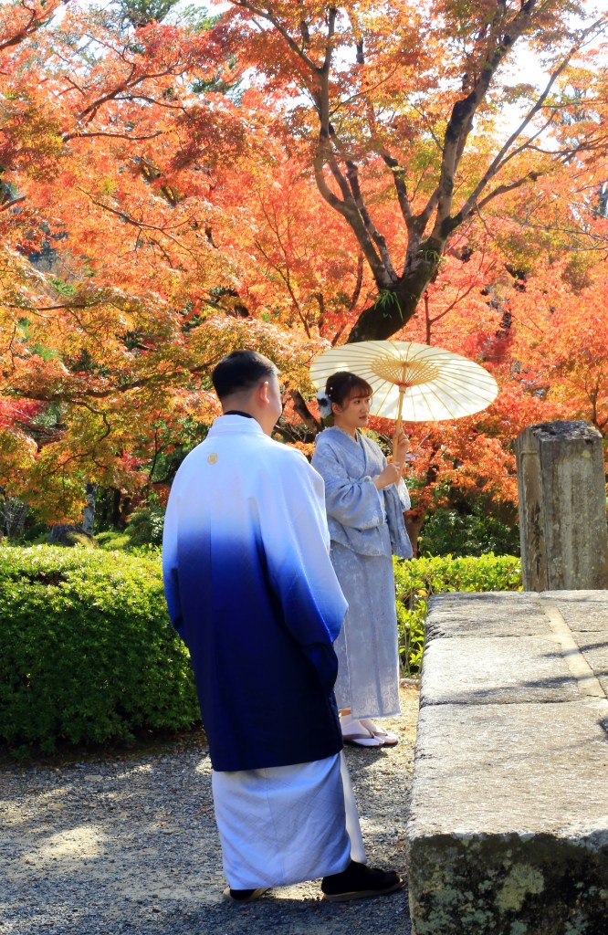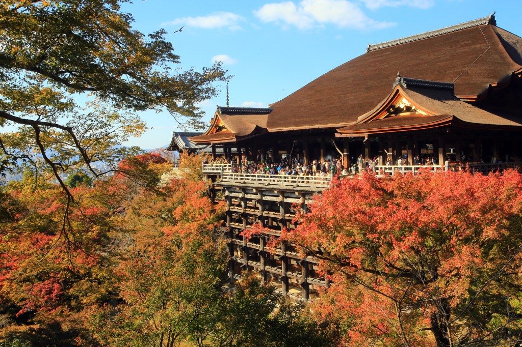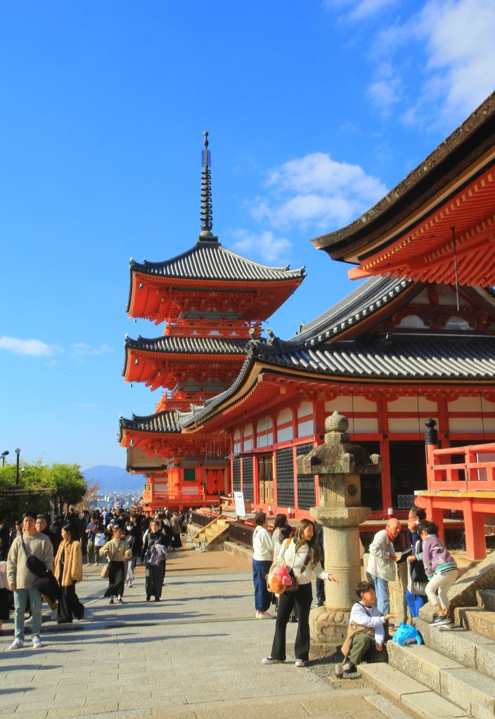 Cuối cùng tôi cũng đến được đền, sau một hồi trôi theo dòng người trên con đường dốc vừa cao vừa xa, lề đường lại hẹp, xe với người lại đông nên mất gần nữa tiếng.Từ xa đã thấy ngọn tháp sơn đỏ vươn cao…và sau đó khu vườn đầy sắc Thu, khách nườm nượp đến chụp hình trong các bộ áo kimono, từ đơn giản đến cầu kỳ, cứ như ngày hội, hèn chi dọc đường lên đền tôi thấy khá nhiều tiệm cho thuê trang phục, làm tóc…