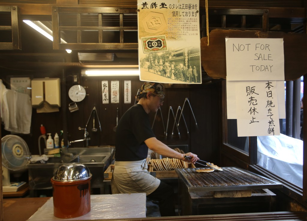 Quay lại với “Little Kyoto”, trời mưa, vắng khách, khách xếp hàng lưa thưa trước tiệm bán sushi với bò Hida nổi tiếng , tiệm bánh gạo, cũng tạm thời ngưng bán, phần vì bận chuẩn bị đợt bánh mới, phần chắc chủ nhà cũng muốn đôi lúc thư thả! Nói đến bánh gạo (senbei), loại bánh truyền thống của Nhật tôi khá thích, làm tôi nhớ lại một trong những lần đi Nhật đầu tiên, biết tôi thích bánh gạo, người đồng nghiệp Nhật dặn nhớ đến cửa hàng “ở đâu đó” mua.