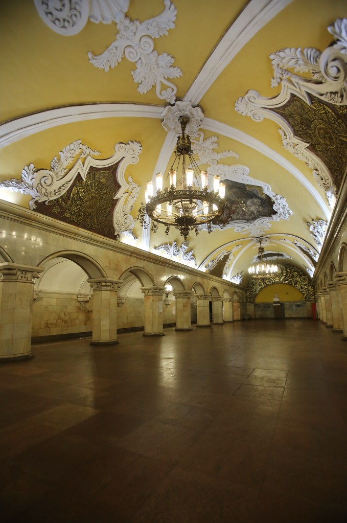 Một lát sau, tôi mới quyết định đi xuống tàu điện ngầm để xem những bến tàu nổi tiếng đẹp như những tác phẩm nghệ thuật, hệ thống tàu điện ở Moscow chính thức hoạt động từ 1935, sau gần 100 năm giờ số bến tàu lên đến 294. Tuy đẹp, nhưng các bến tôi đi qua hằn rõ dấu vết thời gian sau gần trăm năm tồn tại, những bức tường ố vàng, những phù điêu nham nhỡ, những chiếc đèn chùm một thời kiêu sa, giờ xuống sắc chẳng đủ sức soi sáng không gian rộng lớn. Để trùng tu lại, chính quyền Nga chắc phải cần rất nhiều thời gian, công sức và tiền bạc!