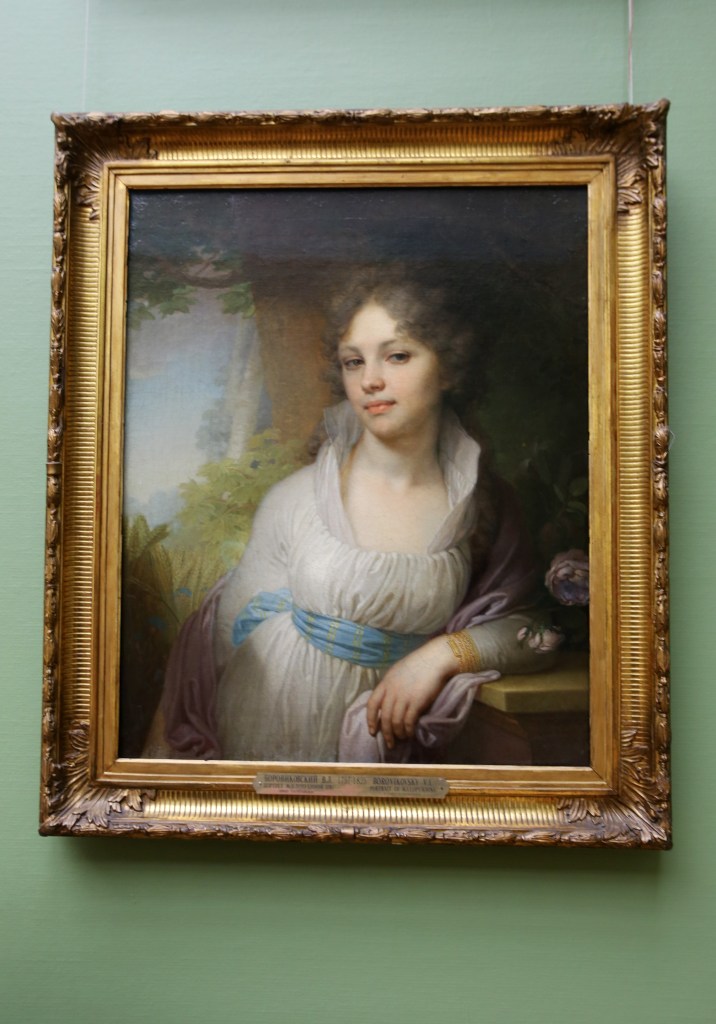 Tôi còn tìm thấy nhiều bức tranh của vài danh hoạ quen thuộc, chân dung Maria Lopukhina của danh hoạ Vladimir Borovikovsky, sáng tác vào những năm cuối của thế kỷ 18, được so sánh như Mona Lisa nước Nga, qua ánh mắt, bàn tay…Thời kỳ này vẽ chân dung với phong cảnh và một số đồ vật khá phổ biến. Từ phong cảnh đến đồ vật, trang phục… đều được tác giả gửi gắm những ẩn ý đằng sau.
