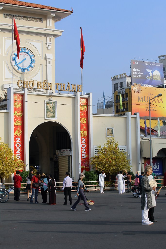 Chợ Bến Thành. Cây cầu đi bộ tôi nhắc đến ở trên bắt đầu từ phía cổng này của chợ. Tôi lại không nhớ mình đã được vào chợ này trước 1975 chưa, thời gian hoặc đã xoá hết ký ức đó, hoặc mách bảo “Trẻ em không được vào chợ, dể lạc ba mẹ!”.