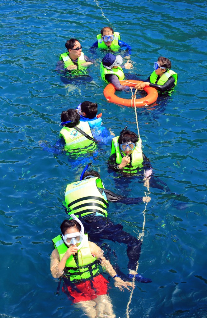 Khách đi sea walking thật ra không đông lắm, có nón dành cho trẻ em. Có người xuống rồi lên ngay, vì hoảng, phải trấn an một chập mới thử lại lần hai. Nơi đi sea walking cạnh hòn đảo tuốt ngoài khơi, có ca nô đến đón khách đăng ký tại các tàu lớn.