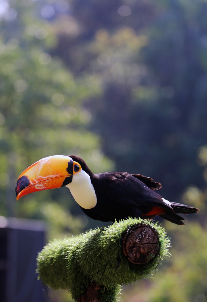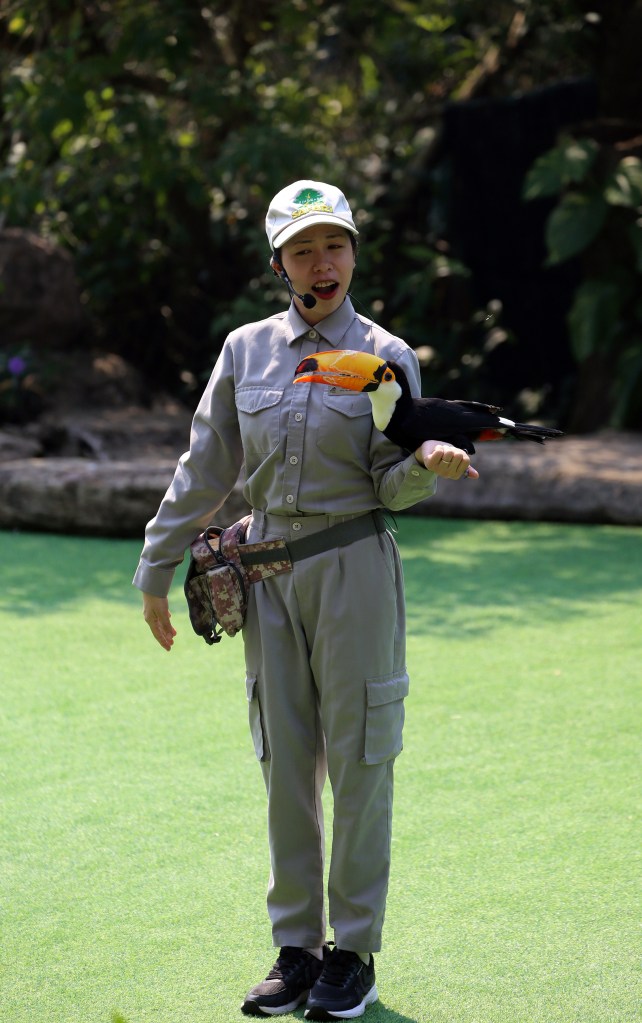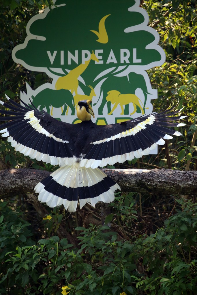 Vừa đến kiosk để đổi vé online sang vòng giấy đeo tay, cô bé trong quầy nói ngay “10 phút nữa có show chim, hôm nay chỉ có một show duy nhất thôi ạ”, thế tôi vội đến chỗ “Bird show”, gần cổng vào. Tôi may mắn chứng kiến một buổi biểu diễn vô cùng thú vị và đầy hào hứng của các loài chim quý hiếm. Do đến sát giờ diễn, các chỗ tốt đều đã kín khách, chủ yếu người nước ngoài, tôi chọn ngồi một bên cánh, hàng đầu, dưới cái nắng chan chan buổi sáng muộn, nhưng không quá nóng, thời tiết tháng Hai ở Phú Quốc đẹp!