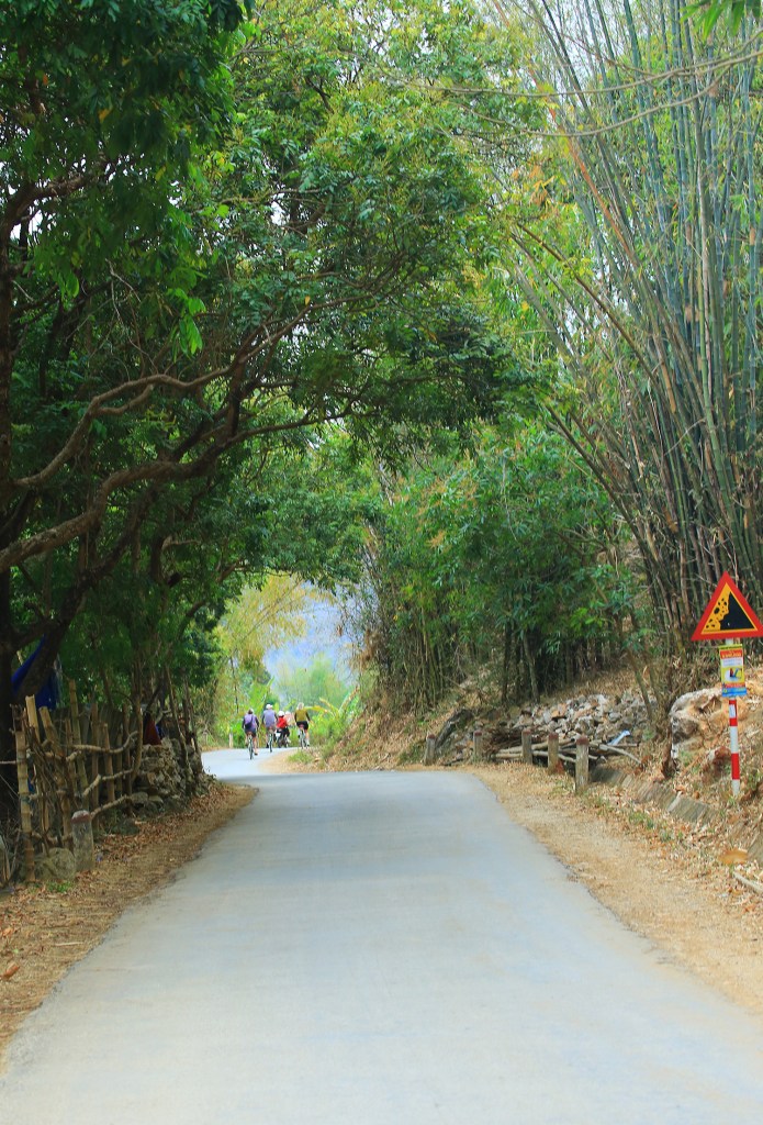 Đường lên Mai Châu mất 3 tiếng hơn, nếu xuất phát từ Nội Bài. Chuyến bay từ Sài Gòn đi Hà Nội của tôi bị hoãn hơn 1 tiếng, đến Mai Châu đã gần 3g chiều. Vậy cũng tốt, đến sớm nhiều khi lại phải chờ. Đường vào khu nghỉ dưỡng không làm tôi hào hứng lắm, như hẻm của con phố nhỏ, đầu hẻm lại có nghĩa trang. Đi một lúc, không gian mới dần đổi qua màu xanh với những vườn rau, ruộng lúa, những bụi tre, gốc chuối và có cả con suối cạn nước, cùng đồi núi bao quanh.