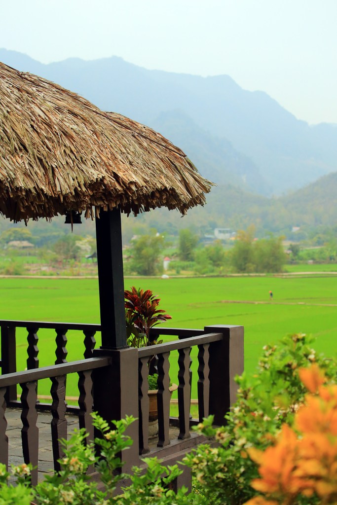 Sau những thủ tục “check-in” thông thường, cô nhân viên xinh xắn người dân tộc Thái nói khách sạn nâng hạng phòng lên cho tôi, có “private pool” nhưng không có “heater” (nhiệt độ ban ngày ở Mai Châu tầm 14-15oC ) và có view đẹp nhất. Tôi thầm hỏi ai xuống hồ bơi mùa này, nhưng vui vẻ cười cám ơn vì cái view đẹp nhất đó!