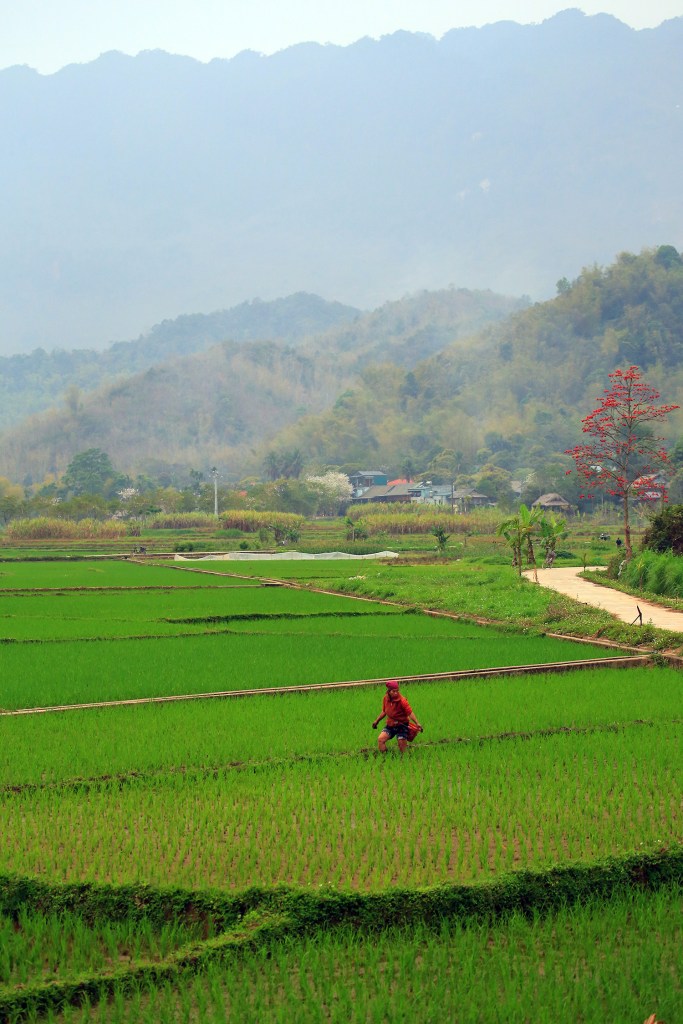 Thời tiết ở Mai Châu đầu tháng Ba rất dể chịu, khí trời mát lạnh nhưng tôi thích nhất chính là không khí trong lành của vùng núi, với cảnh vật bao quanh. Những cánh đồng xanh mướt mát cả mắt, có điều sau này hỏi các bác nông dân gần đó, tôi mới biết ruộng đang khát nước, mấy tháng nay trời không đổ mưa. Nổi buồn người trồng lúa khi cách mùa gặt chỉ còn vài tháng.