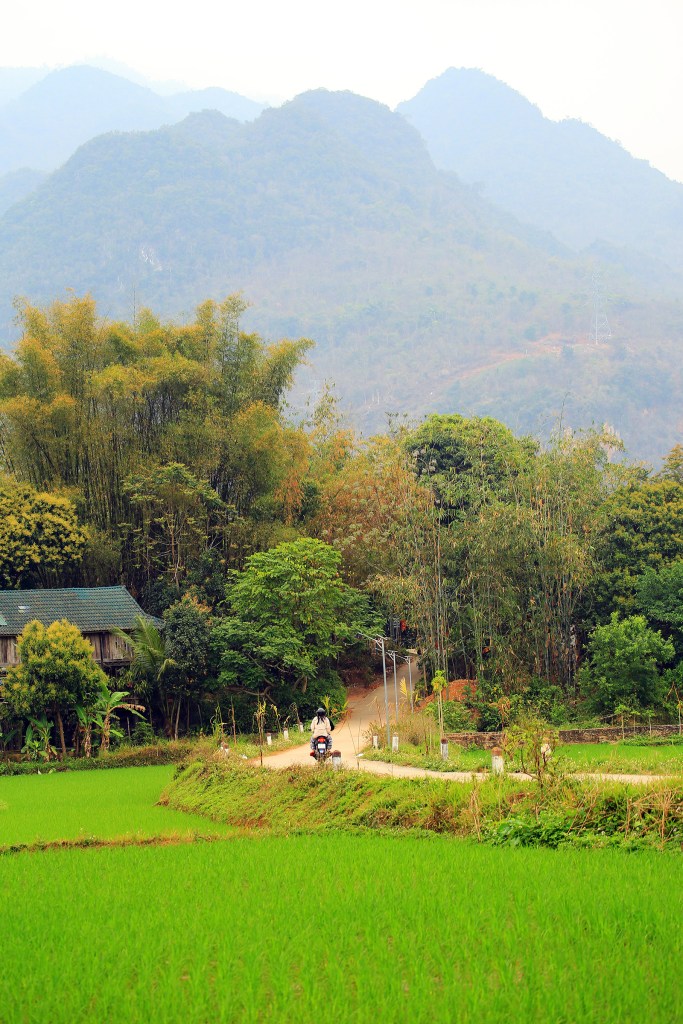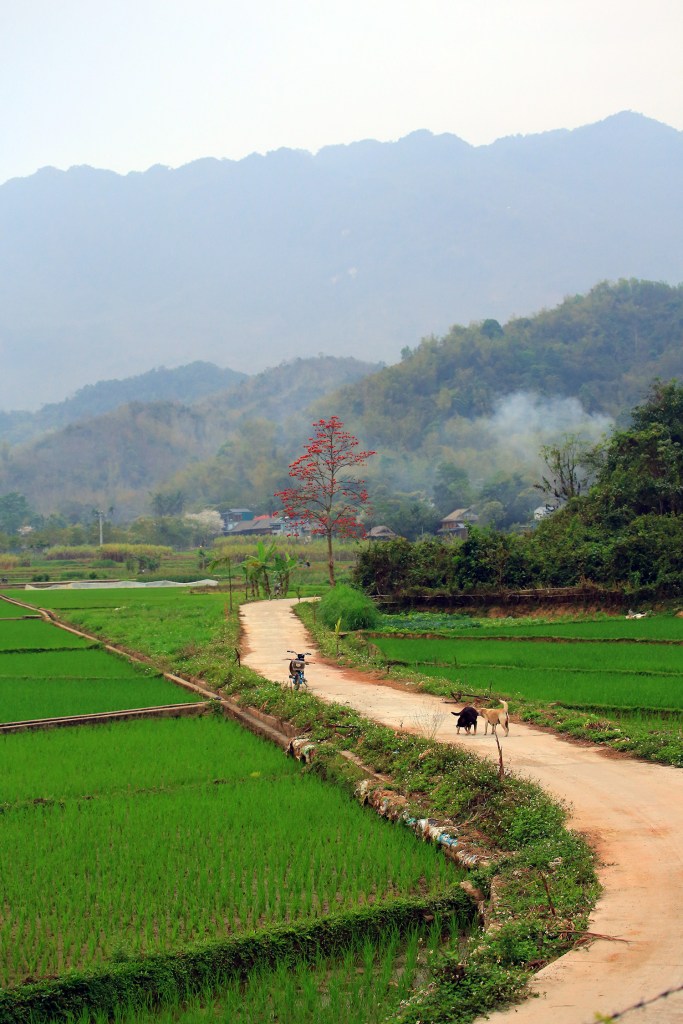 Tôi quen với xe ở nhà, nên xe đạp mượn làm tôi hơi lúng túng, xe không cao không thấp, túi máy ảnh khá nặng để đầu xe nên vừa dựng xe – xe chịu không nổi ngã ngay! Dù sao xe cũng đưa tôi đi khá xa, ra thị trấn, dọc theo con lộ chính, vào các bản làng, thậm chí tưởng lạc vào ngỏ cụt nhưng tất cả đều thông nhau ra lộ chính.