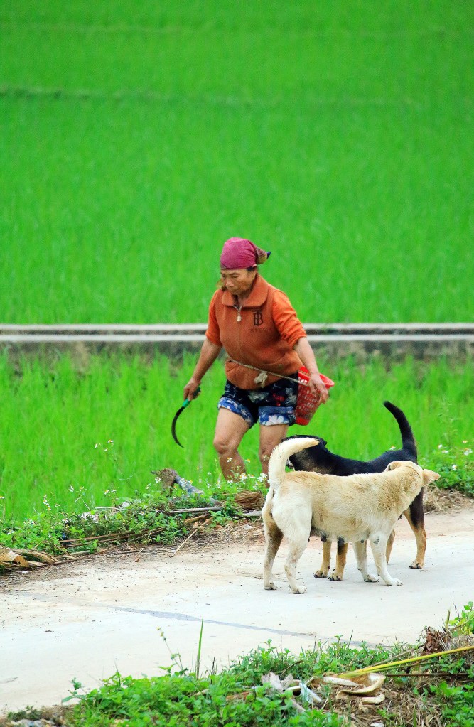 Về chiều, tôi lại đi bộ. Lúc vô tình theo sau đoàn khách Tây, lúc lạc lối giữa những ngã đường quê, lúc bị lũ “boss” ùa ra sủa một chập, xong lại vẩy đuôi mừng. Có lúc tôi định liều bước lên những lối đi xuyên ruộng, nhưng được vài bước tôi đổi ý ngay. Tay cầm máy, vai đeo túi tôi khó giữ thăng bằng trên lối đi chỉ vừa đủ hai bàn chân.