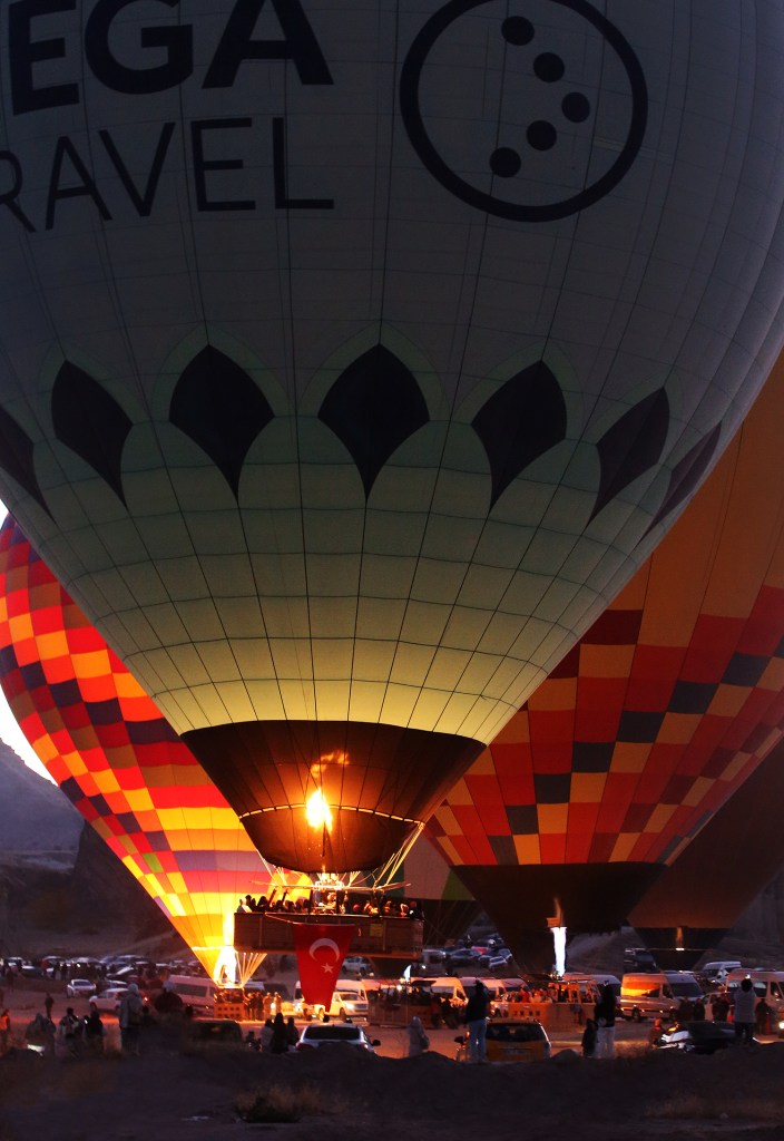 Sáng sớm hôm sau, trời còn tối, tôi đã vội ra ngoài nghe ngóng chuyện khinh khí cầu. Vừa tới lộ chính, tôi thấy các xe bán tải lớn chở giỏ treo và đống vải vo tròn thật to (khinh khí cầu khi chưa có hơi) liên tục chạy về hướng trang trại ngựa, nơi hôm qua tôi đến xem đàn ngựa nổi tiếng của vùng này. Lúc này, tôi mới tin hôm nay mình sẽ tận mắt thấy cả trăm khinh khí cầu trên bầu trời Göreme!