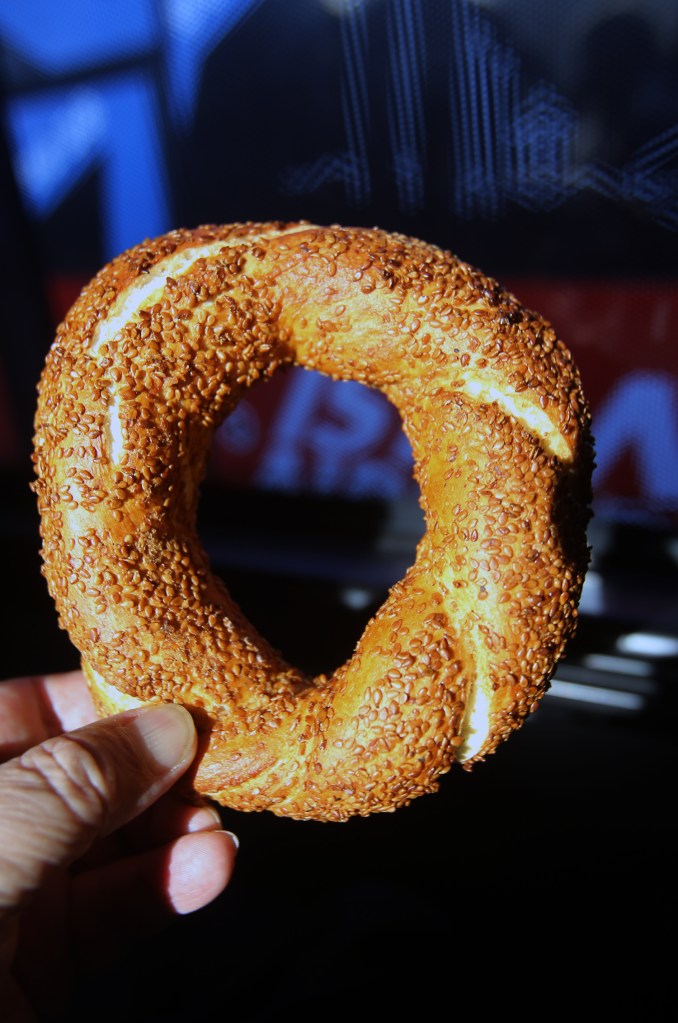 Đây là bánh simit, bữa sáng quen thuộc của người dân ở đây, dùng với phô mai, với mứt…và ly trà nóng, là bánh simit đầu tiên tôi mua sau suốt 2 tuần ở đây và trong buổi sáng cuối cùng ở Istanbul, đem ra sân bay, lên máy bay và bay về nhà! Ngày hôm sau tôi nướng lại và ăn! Vẫn ngon nhưng đã thiếu đi hương vị Istanbul!