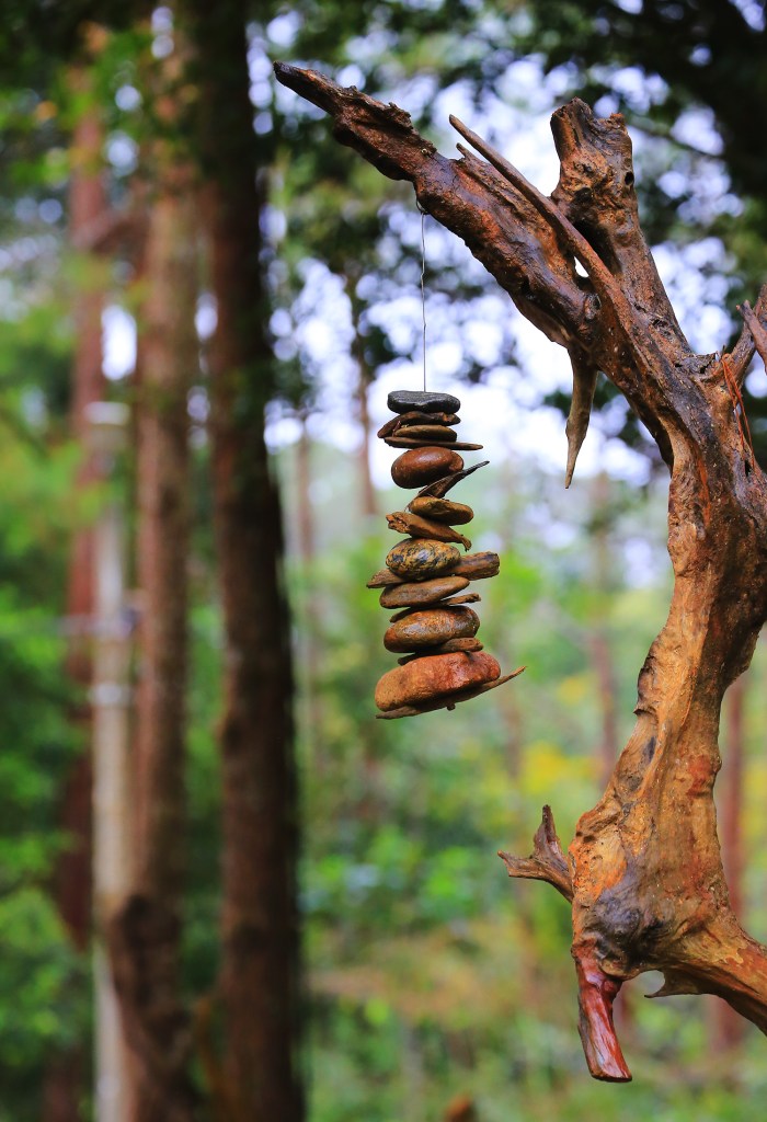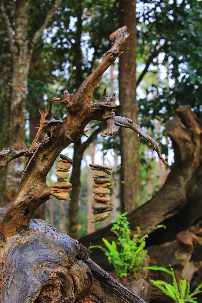 Tôi cũng chẳng biết đi đâu giữa rừng thông bạt ngàn, khi các vị thần, thần rừng, thần suối, thần muông thú… như vẫn đang say giấc. Hai từ Măng Đen có nghĩa vùng đất của những vị thần! Đi ngang một ngã tư lớn, tôi thấy khu vườn rộng trưng bày đầy những viên đá chồng lên nhau, hoặc treo lủng lẳng trên những cành cây khô, những tượng gỗ, những gốc cây khổng lồ… nhìn như một góc vườn nghệ thuật sắp đặt. Lạ và hay.