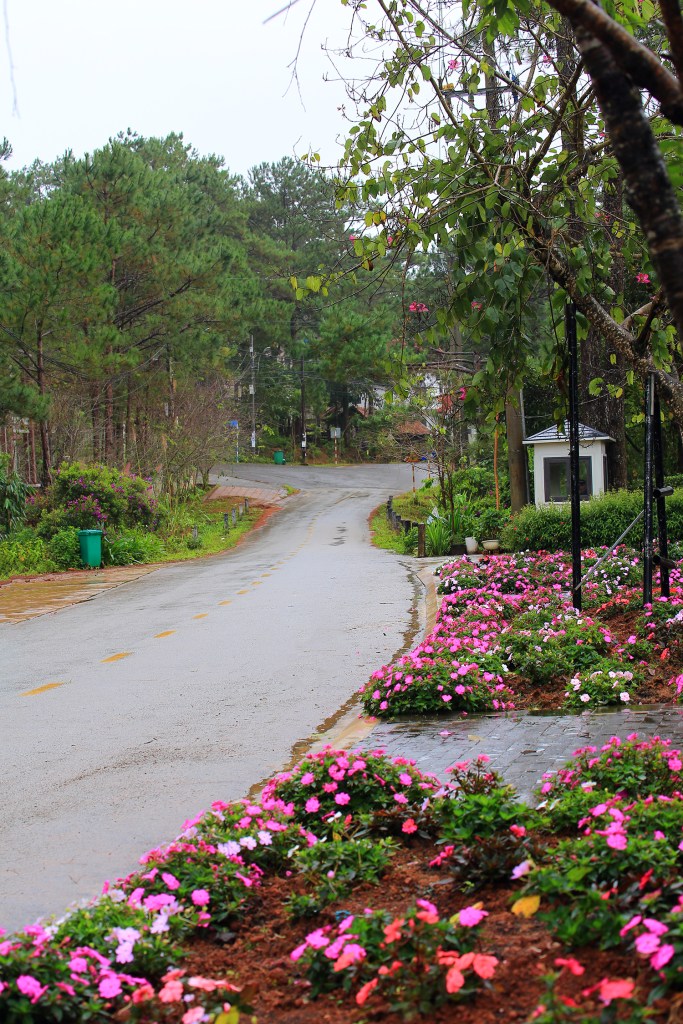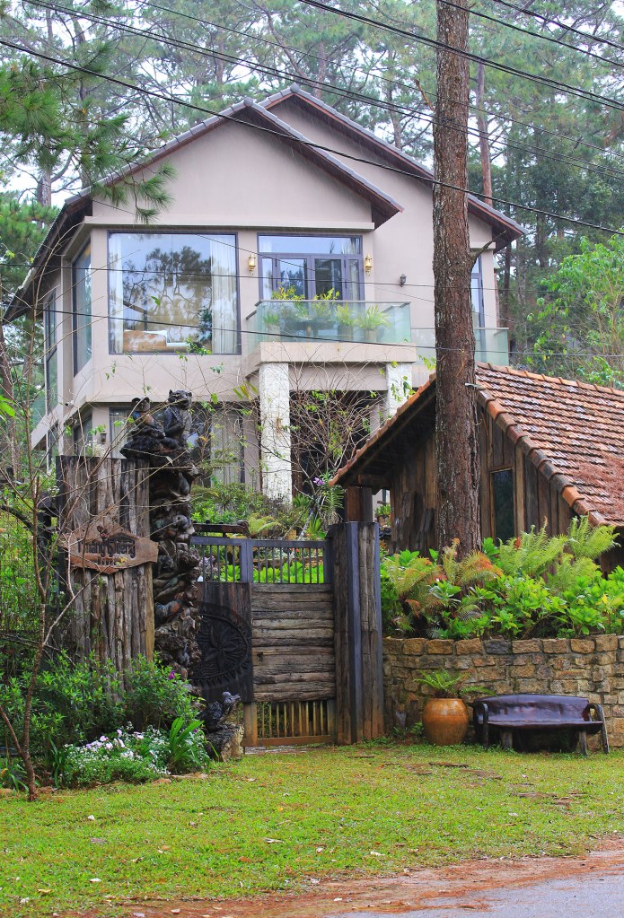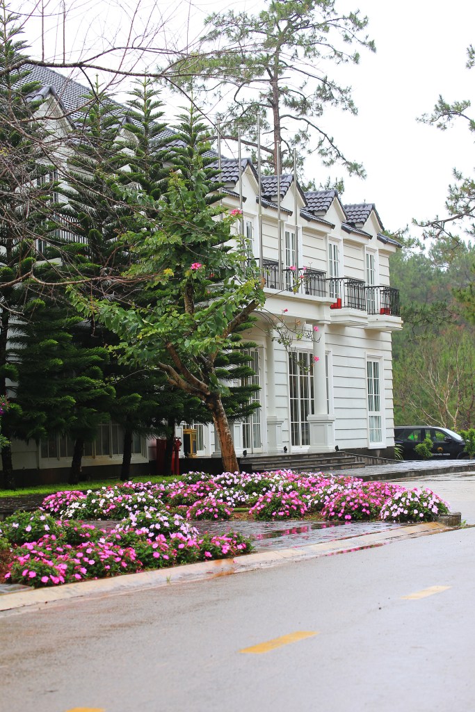 Đi thêm một đoạn, chúng tôi quẹo vào con đường khác, cảnh quan khác hẳn, những biệt thự – homestay, khách sạn sang trọng dần dần hiện ra, không nhiều…nhưng chủ đầu tư hình như không tiếc tiền. Có kiến trúc hài hòa với không gian, có kiến trúc nổi bật nhưng khá lạc điệu. Một cung điện trắng giữa rừng thông! Mưa bụi vơi dần, không còn làm ướt người. Trời vẫn se lạnh.