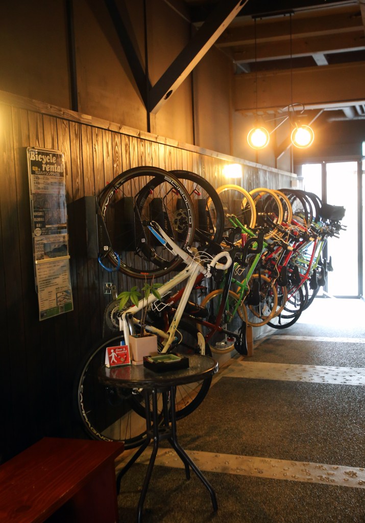 Ryokan tôi ở, phía dưới là tiệm cà phê và rượu, trên lầu chiều tối là nhà hàng, chủ nhân khách sạn chắc dân road bike (dân chạy xe đạp đua) nên ngay từ dưới nhà lên tận trên phòng, đâu cũng thấy xe đạp, trong phòng tôi các vật dụng trang trí toàn xe đạp, thậm chí trong toilét!